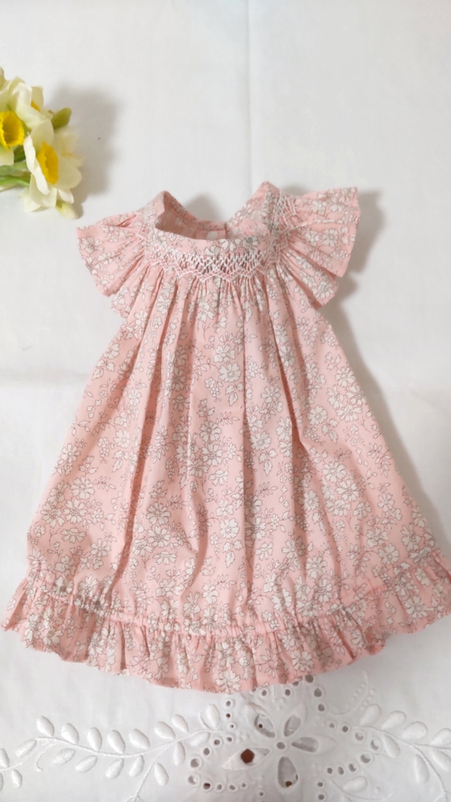 リバティプリントは、イギリスの人気ブランドが手掛ける布地です。美しい花々が描かれたデザインと肌触りのよい綿100%の上質なタナローン生地が有名です。さらに、美しいスモッキング刺繍がドレスを飾り、より一層高級感を演出しています。