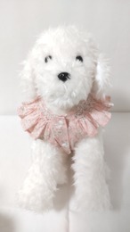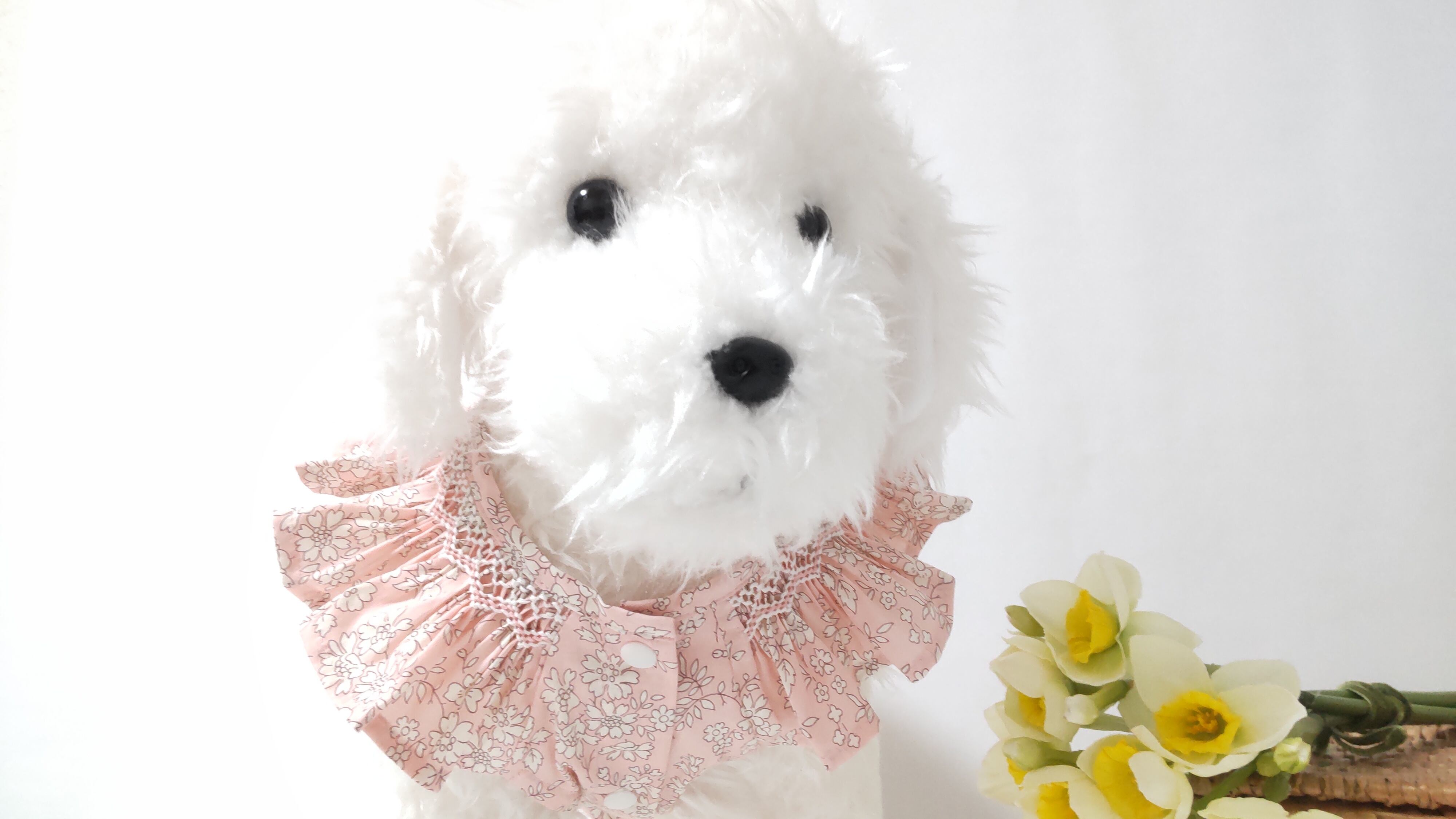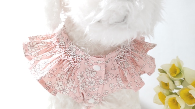 首回りに均一に施したスモッキング刺繡によって綺麗なギャザーが入りワンちゃんの顔回りが華やかに可愛く見えます。