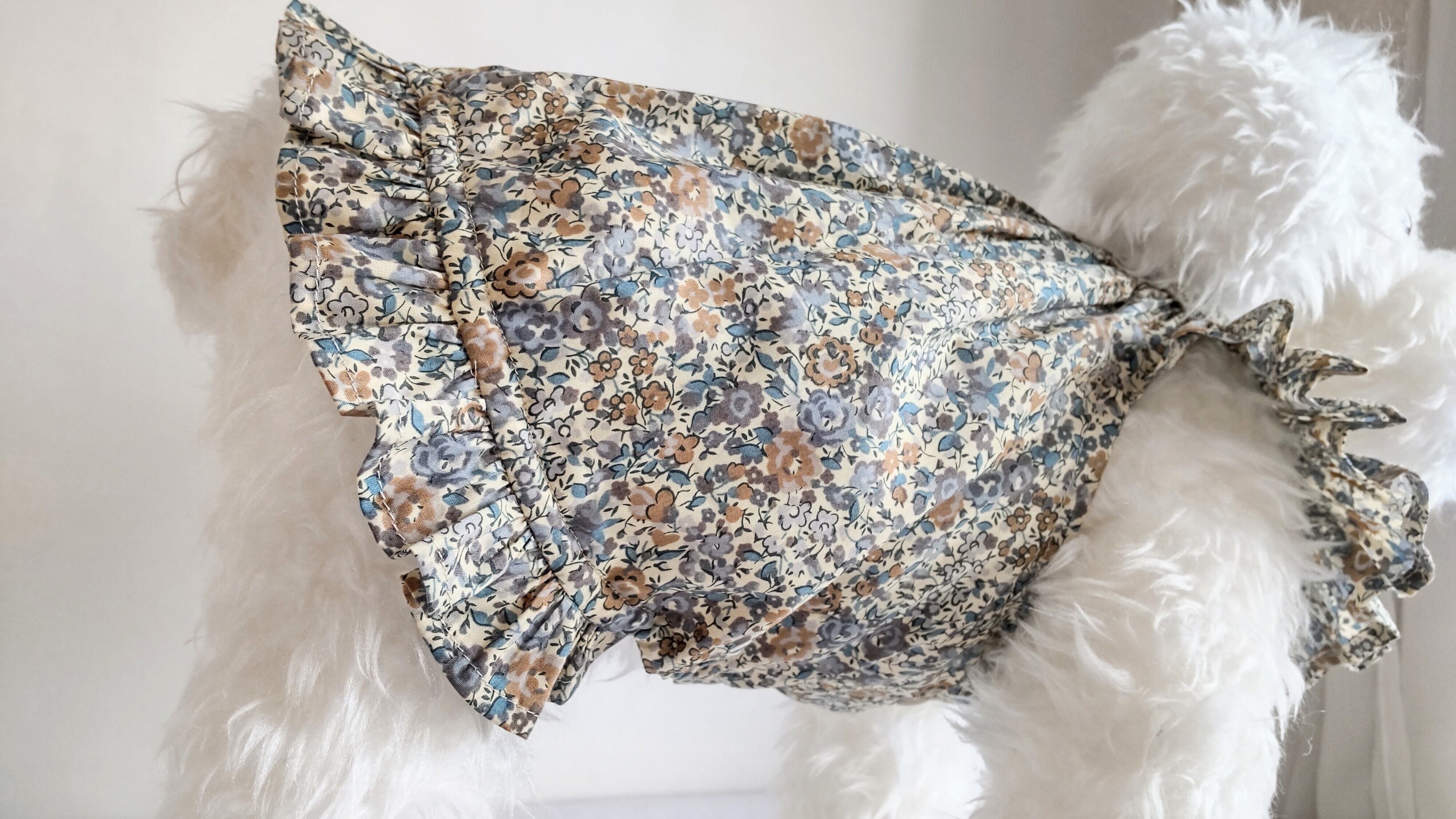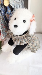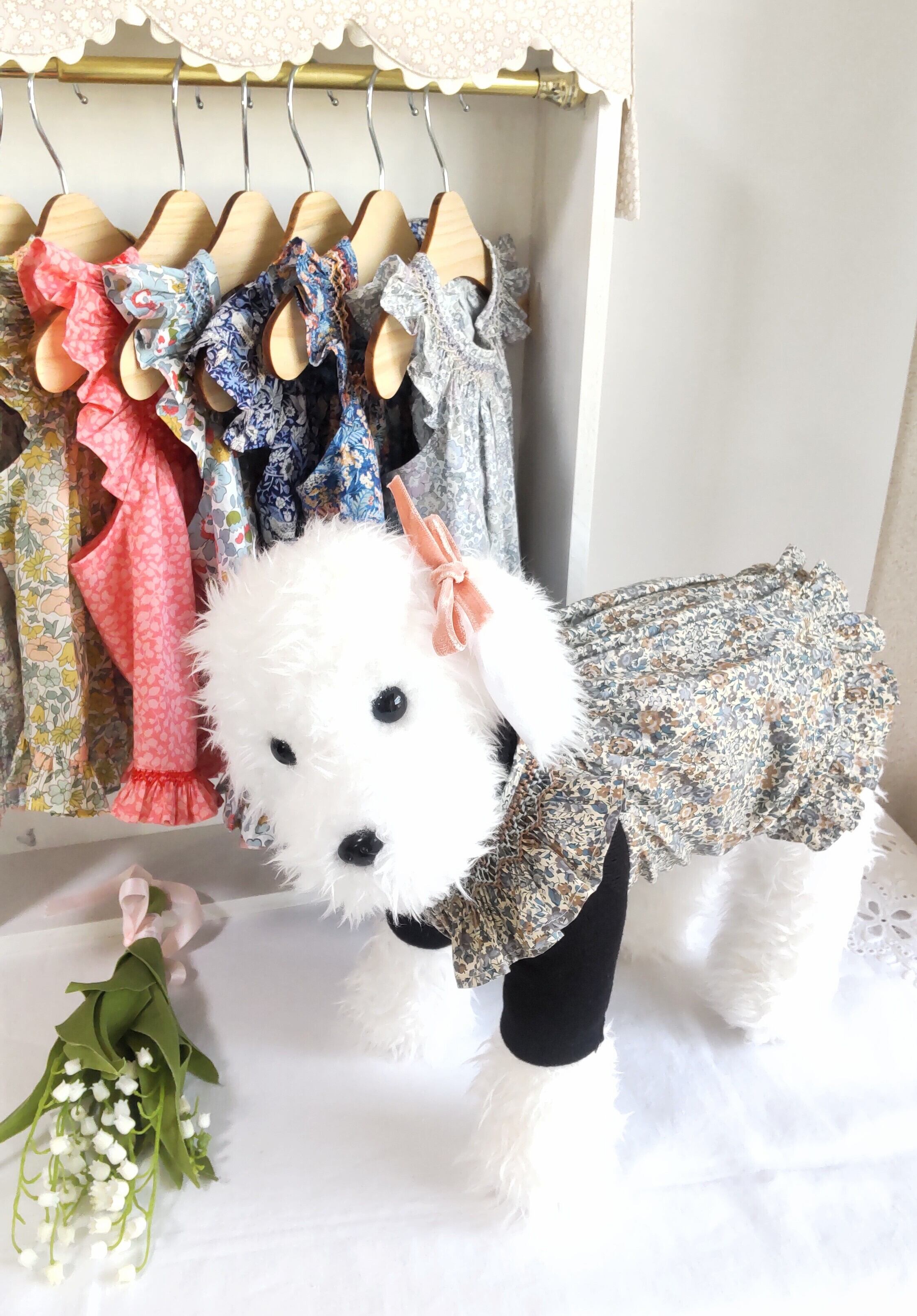 華やかなリバティプリントと繊細な刺繍が施されたこのドレスは、愛犬に上品でおしゃれな雰囲気を与えてくれます。