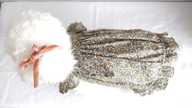 リバティプリントは、イギリスの人気ブランドが手掛ける布地です。美しい花々が描かれたデザインと肌触りのよい綿100%の上質なタナローン生地が有名です。さらに、美しいスモッキング刺繍がドレスを飾り、より一層高級感を演出しています。