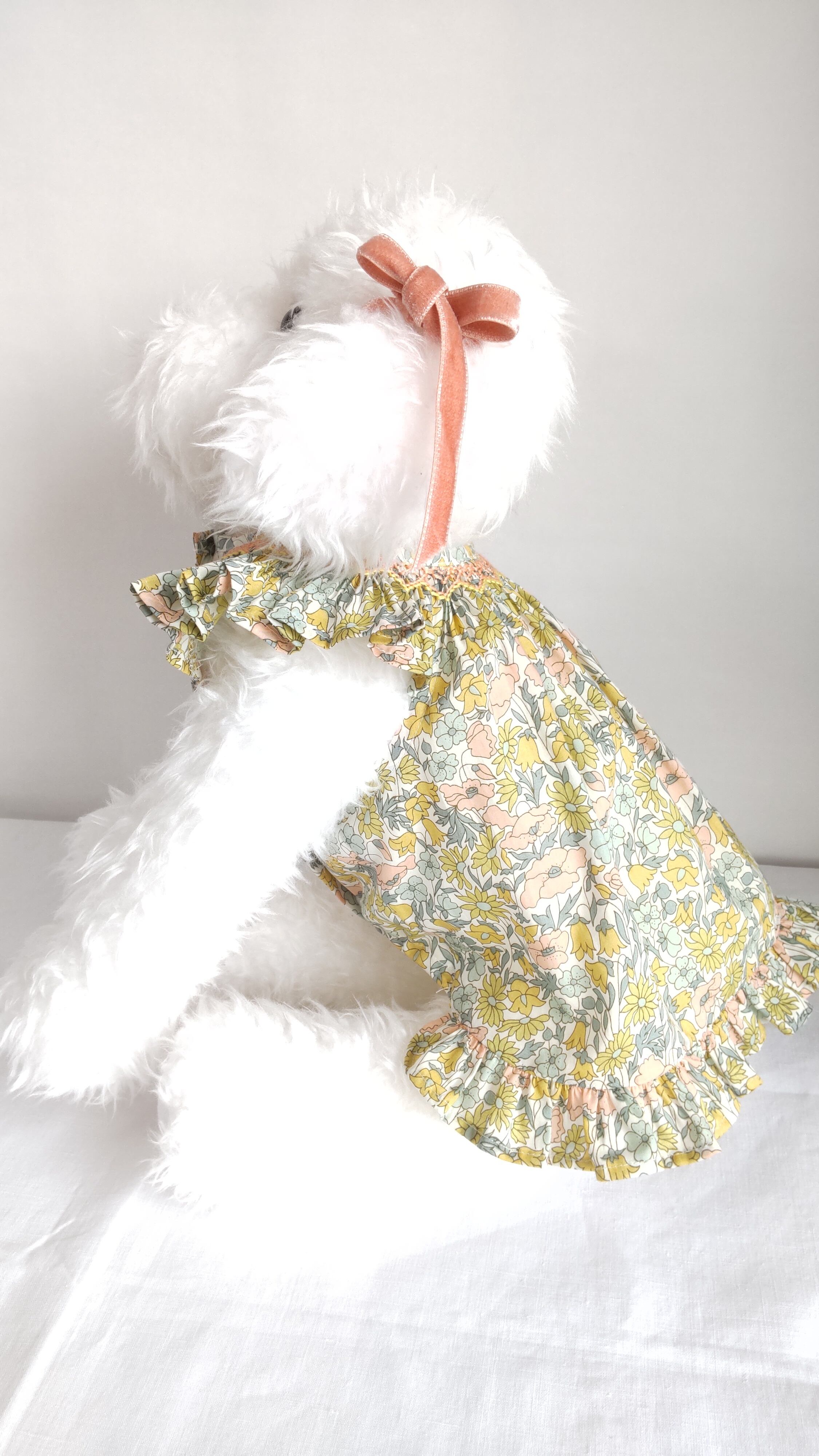 可愛らしい犬服「スモッキング刺繍のリバティプリントドレス」が登場しました!