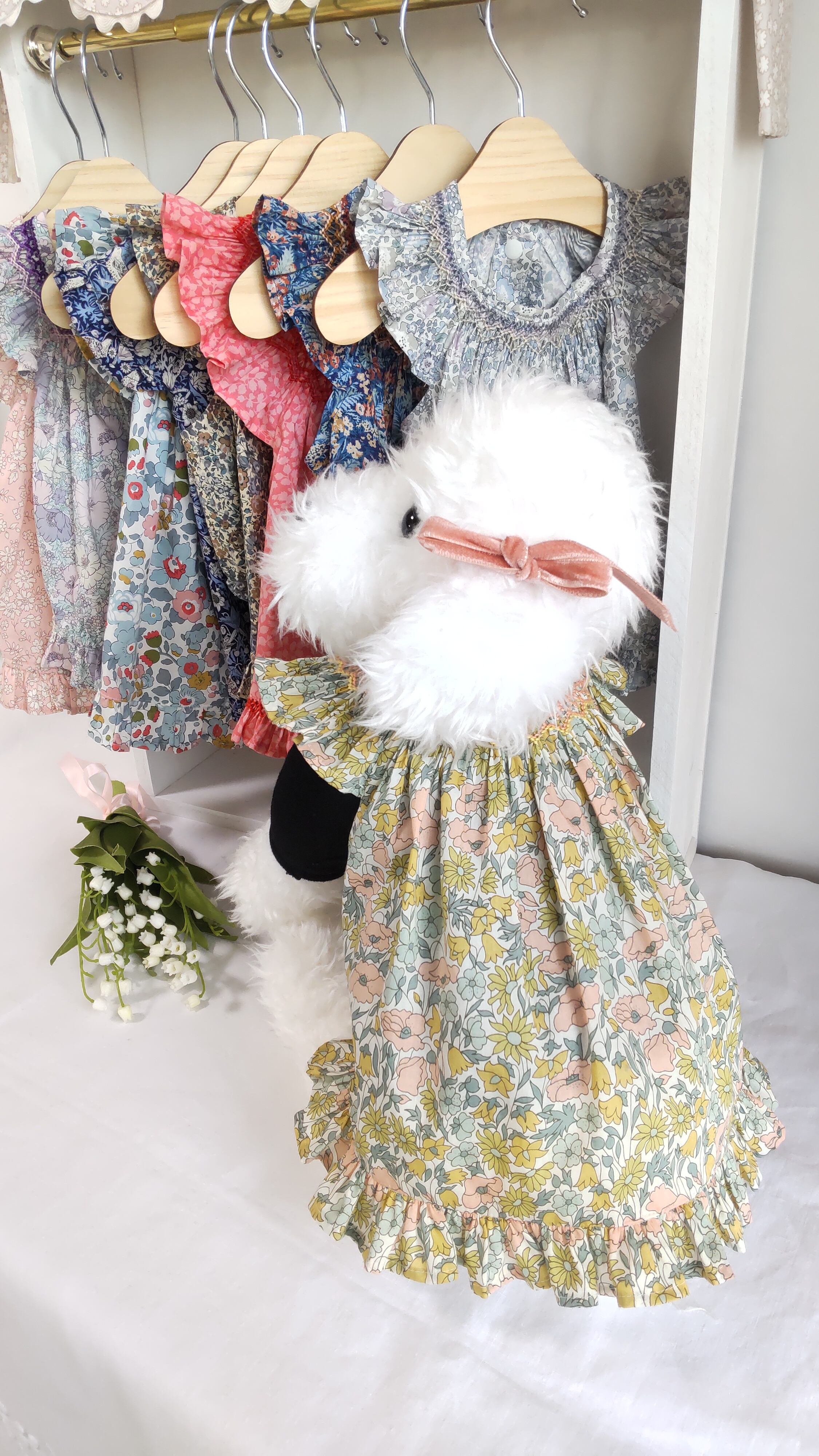 リバティプリントは、イギリスの人気ブランドが手掛ける布地です。美しい花々が描かれたデザインと肌触りのよい綿100%の上質なタナローン生地が有名です。さらに、美しいスモッキング刺繍がドレスを飾り、より一層高級感を演出しています。