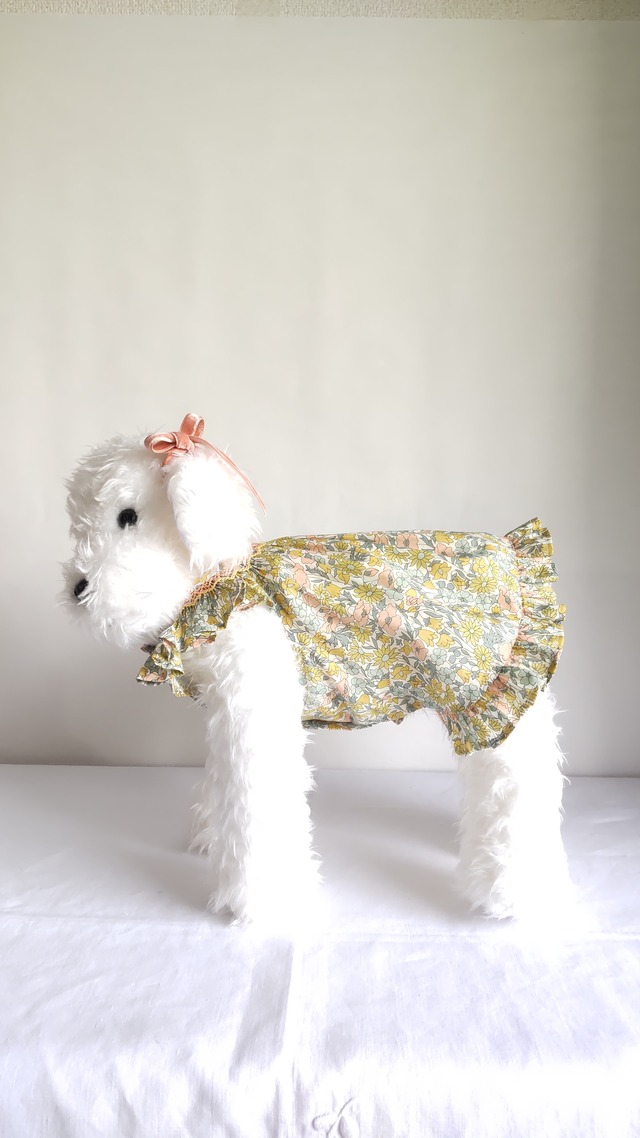 華やかなリバティプリントと繊細な刺繍が施されたこのドレスは、愛犬に上品でおしゃれな雰囲気を与えてくれます。