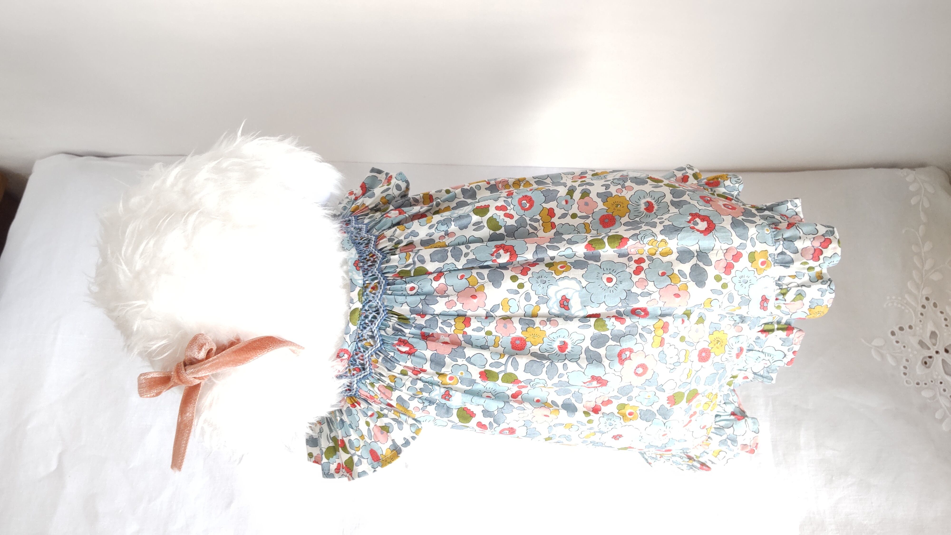 リバティプリントは、イギリスの人気ブランドが手掛ける布地です。美しい花々が描かれたデザインと肌触りのよい綿100%の上質なタナローン生地が有名です。さらに、美しいスモッキング刺繍がドレスを飾り、より一層高級感を演出しています。